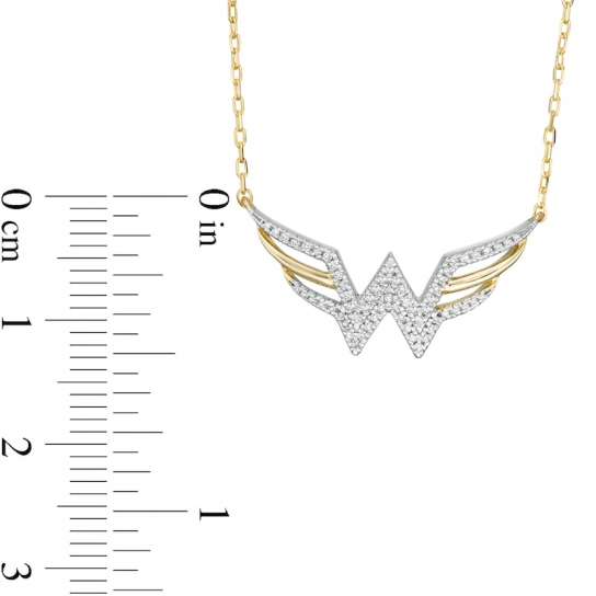 Crafted in warm 10K gold, this look showcases diamond-lined ribbons sculpted into the classic “WW” logo at the center. Polished ribbons complete the triple-row wing design. Radiant with 1/8 ct. t.w. of diamonds and a brilliant buffed luster, this symbol suspends centered along an 18.0-inch cable chain, with an additional closure ring at 16.0 inches, that secures with a spring-ring clasp. This exclusive fine jewelry collection inspires you to wear your strength, confidence and power.