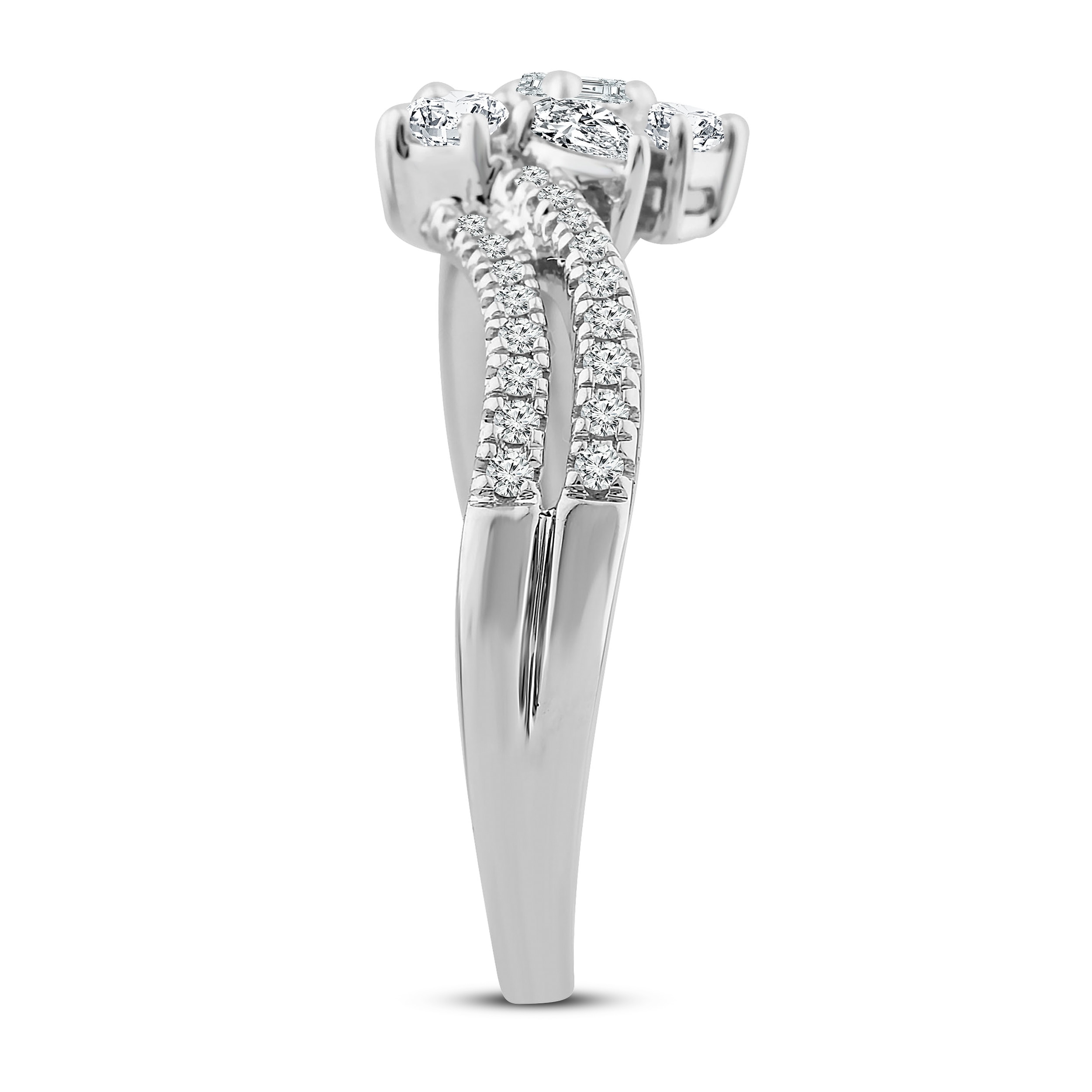 This enchanting diamond ring collection features five distinctively-shaped diamonds, symbolic of everything she means to you. Each diamond shape has a different meaning, from integrity and wisdom, to confidence, totality, and elegance. The beautiful 10K white gold ring features an oval-cut, emerald-cut, pear-shaped, round-cut, and princess-cut diamond at the center, while ribbons of brilliant round-cut diamonds flow outward. The gorgeous ring has a total diamond weight of 1/2 carat.